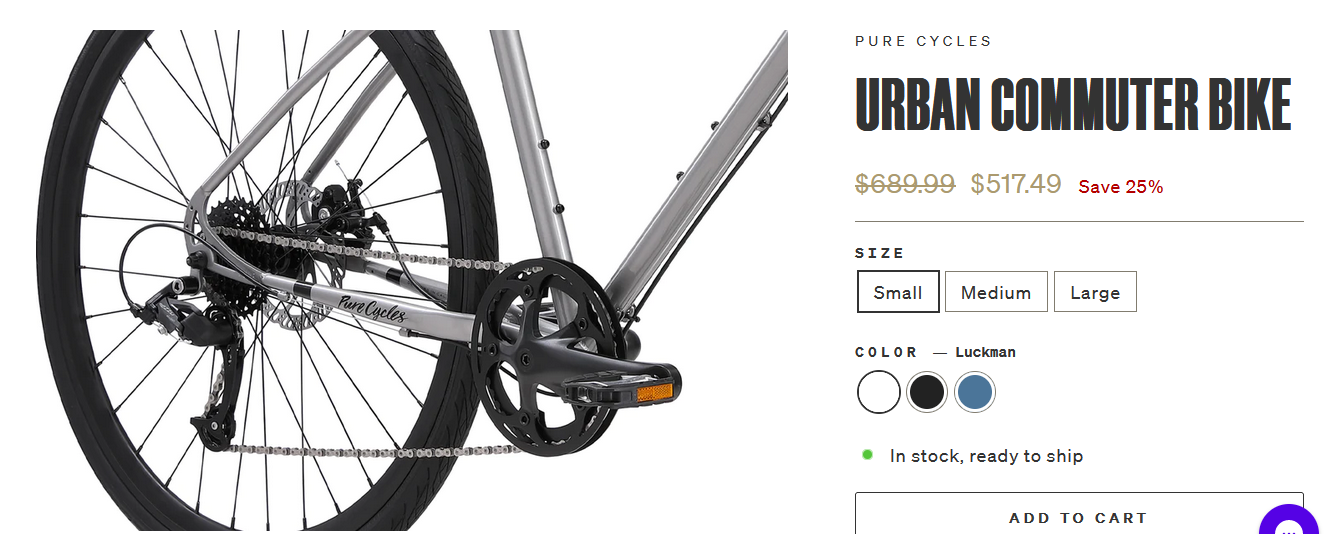 The Pure Cycles Urban Commuter Bike starts at $449 for the single-speed model and $517 for the 8-speed model.