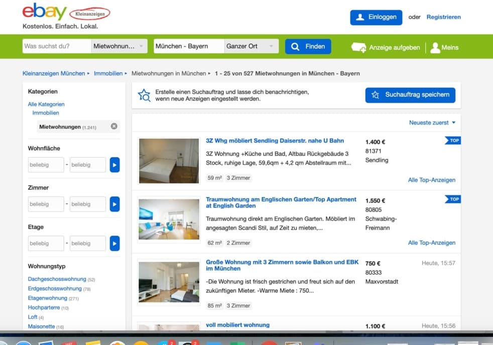 German eBay.de has a special feature called Kleinanzeigen dedicated to private listings. There, you can find various offers from apartments, rooms, and cars to jobs to diverse services. This website is essentially the German version of Craigslist or Gumtree.