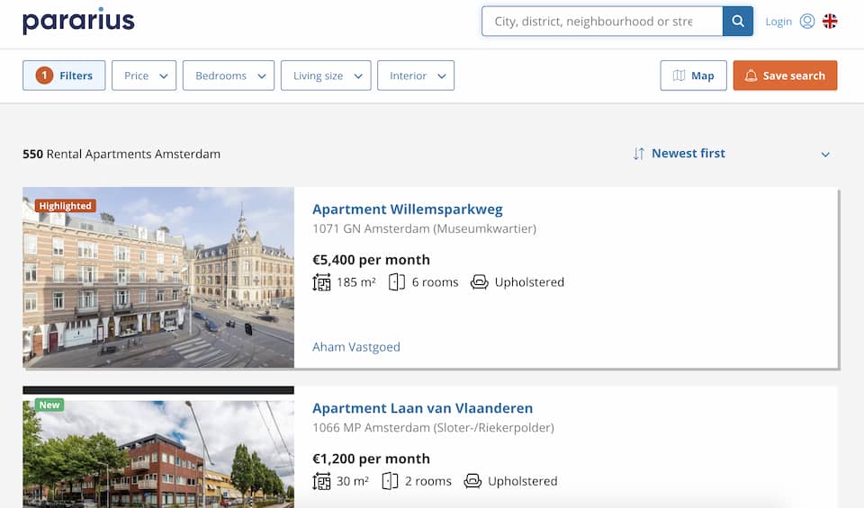 Pararius.com is one of the largest independent websites where you can find apartments for rent in the Netherlands. It connects landlords and future tenants. The significant advantage of this platform is that it’s multilingual, including English. The disadvantage, however, is that most listings are from real estate agencies.