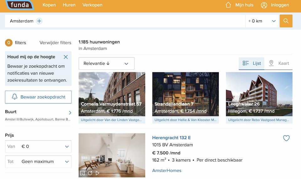 Funda.nl is a much larger website for finding homes and apartments than Pararius.nl. For example, for Amsterdam, it shows 1,185 listings compared to only 552 on Pararius.nl.