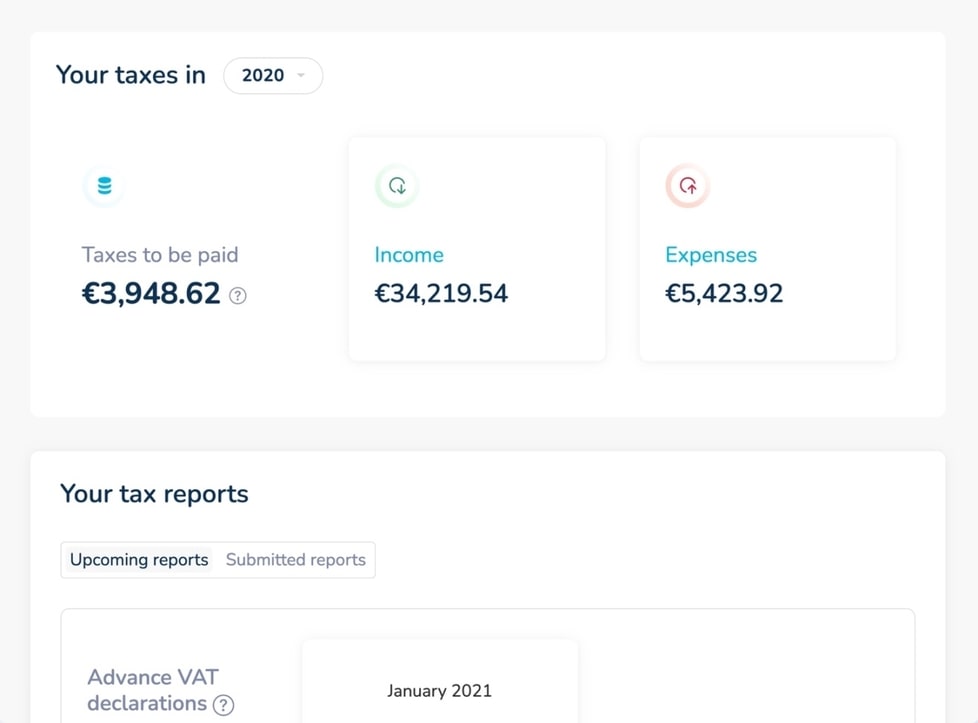 Most importantly, it allows you to submit your tax reports to the German tax office. Based on your income and expenses, Sorted will automatically fill in all of your tax reports, and after that, you can submit it online with one click.