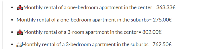 As you move out of the town center to the suburbs, the rent prices fall to 500 EUR for a one bedroom and 1,200 EUR for a three-bedroom.