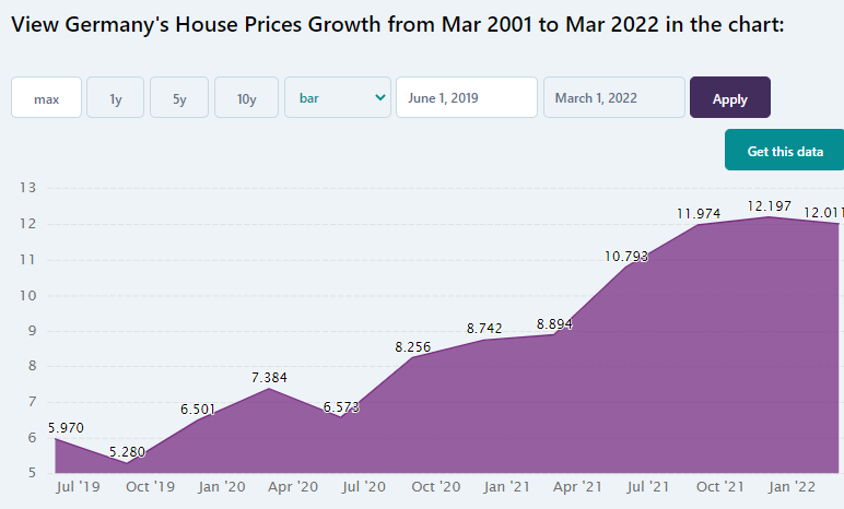 House prices in Germany have been rising over the years, with a 12% increase as of March 2022. Below is a graph showing the growth trend over the last three years.