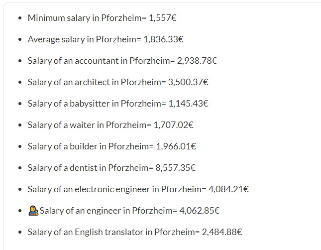 Pforzheim’s average salary rate stood at 1,835 EUR net in 2021, with most of the population working in the industrial, tourism, information technology, and finance sectors. Below is a look at salaries in the different fields.