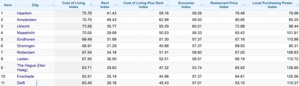 Below is a table that shows how the cost of living within the different cities in the Netherlands compare:
