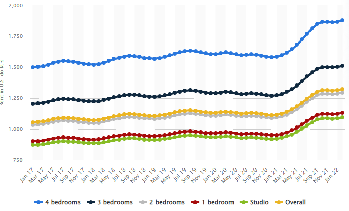 In the US, rent prices have seen a steady rise in the last few years, as seen in the graph below: