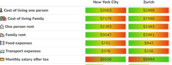 Cost of living in Switzerland vs New York