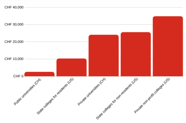 As the children progress to universities, Switzerland offers competitive tuition rates compared to the US, as seen below: