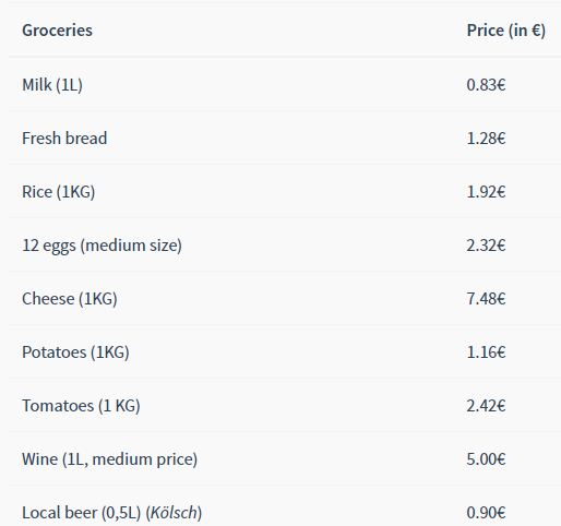 Your everyday costs will cater for groceries and transport. Since Cologne is a tourist hub, you’ll have access to readily available and affordable groceries compared to Munich, where the costs are higher.