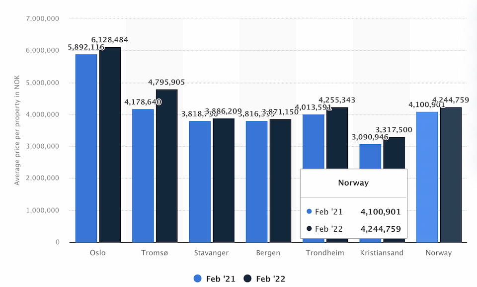 In 2022, Oslo, the Norwegian capital, has the highest prices on apartments and houses. The average price per residential property in Oslo was about 6.1 million NOK or 6,128,484 NOK (581,770 USD) as of February 2022.