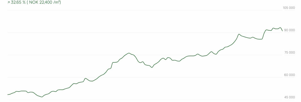 The average price per square meter is 91,013 NOK (8,639 USD). It’s a 5,5% change from last year.