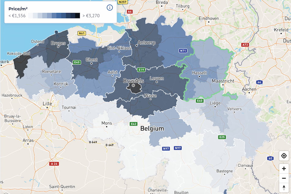 In the graphic below, you can see the house prices across Belgium and the differences between regions: