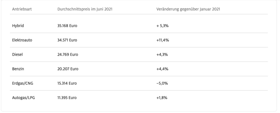 Prices for used cars in Germany continued to rise in summer 2021. Among all engine types, electric cars cost significantly more than the average used car on the market.