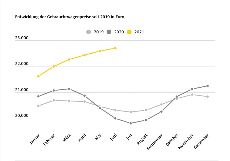 In March 2021, the average price of a used car in Germany was 22,258 EUR, which is more than 1,000 EUR higher than in March 2020. In comparison, in the US, the average price for a used vehicle has jumped more than 21% to about $25,400 from $20,900 a year ago.