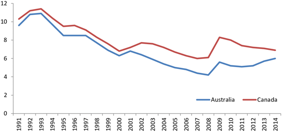 Here is a graph showing the unemployment rate (%) in Canada and Australia between 1991 and 2014: