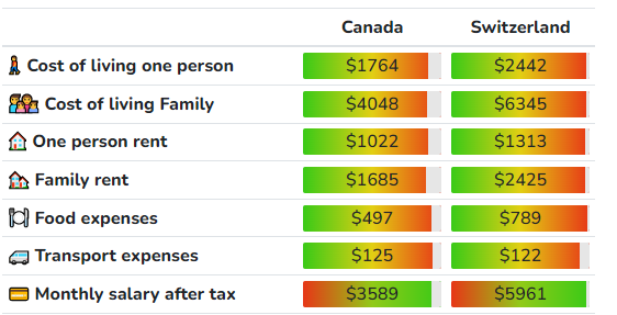 The cost of most expenses in Switzerland is higher than in Canada, and these include: