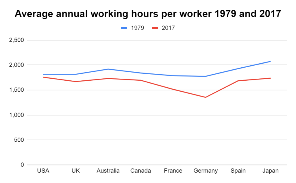 In addition, below is a graph showing the average annual working hours per worker in different countries, including Germany and USA, in 2017 and 1979: