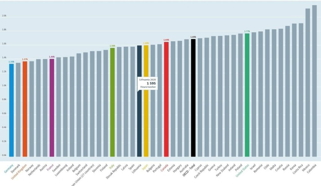 Here is the overview from the OECD on the number of hours worked in 2020 among all European countries and the US. In Germany, the average working hours were 1,332. Compared to the US, where this number was 1,767.