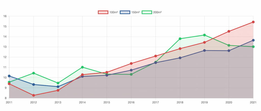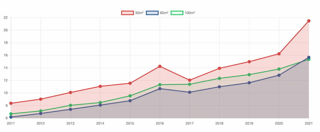 Rent is highly influenced by the size of the apartment. So, the smaller the place, the more expensive it is. The picture below shows how rent prices (per m²) of different apartment sizes have changed from 2011 to 2021.