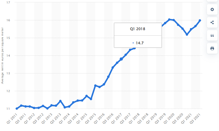 In 2021, the Netherlands’s average rate of an unfurnished apartment stood at 16 EUR per square meter. The amount has since risen to 17.18 % in 2022, and the rate is projected to increase further.