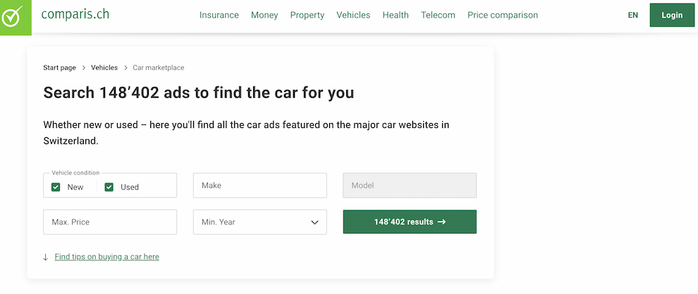 Comparis is a great site not only for finding a car in Switzerland but much more, including various insurances, houses & apartments, and even cable internet deals. All services are available in English.