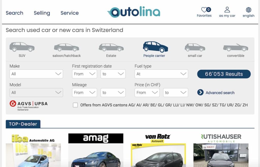 Autolina.ch is a smaller car marketplace with offers from Swiss dealers. The website has an English version. Currently, about 66,053 vehicles are listed on Autolina.