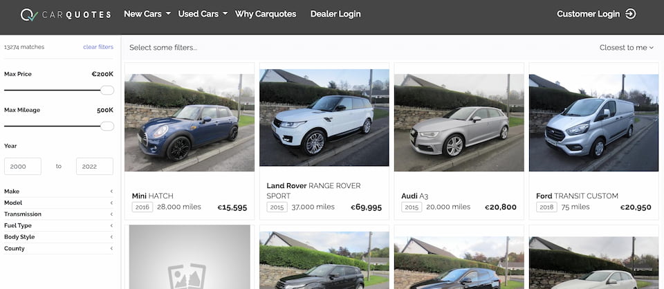 The majority of offers on Carquotes.ie are from manufacturer-approved dealerships. Currently, there are over 13 thousand used cars available on the website.