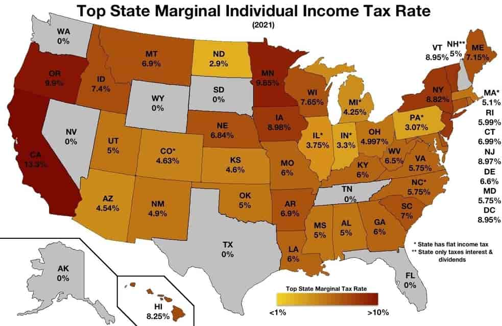 The US has unequal income taxes for each state. You can see the rates of each state in the image below: