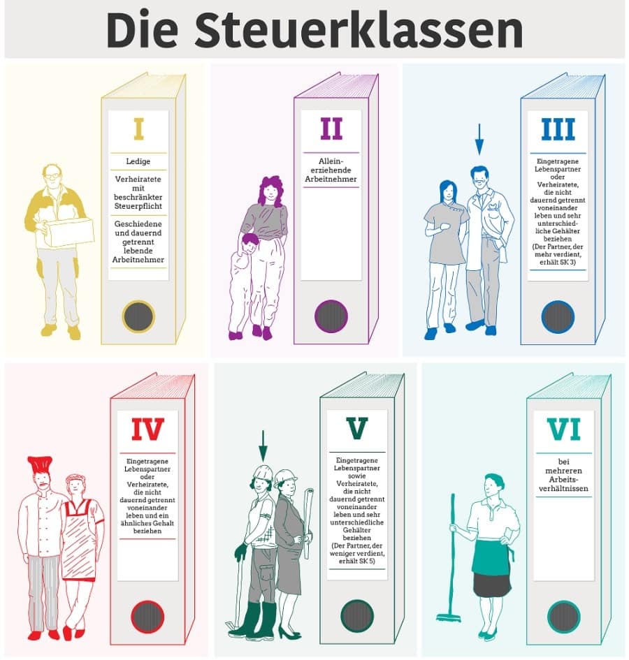 This system isn’t easy to understand, but a single working individual without children pays the highest taxes. Below you can see 6 tax categories (classes) in Germany: