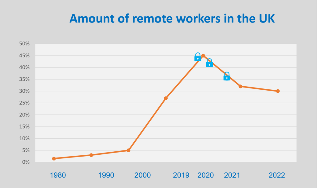The graph below shows the number of people working remotely in the UK and how the number has increased over the last few years: