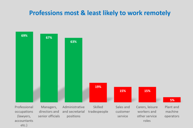 Below is a graph showing professions that are most and least likely to work remotely in the UK: